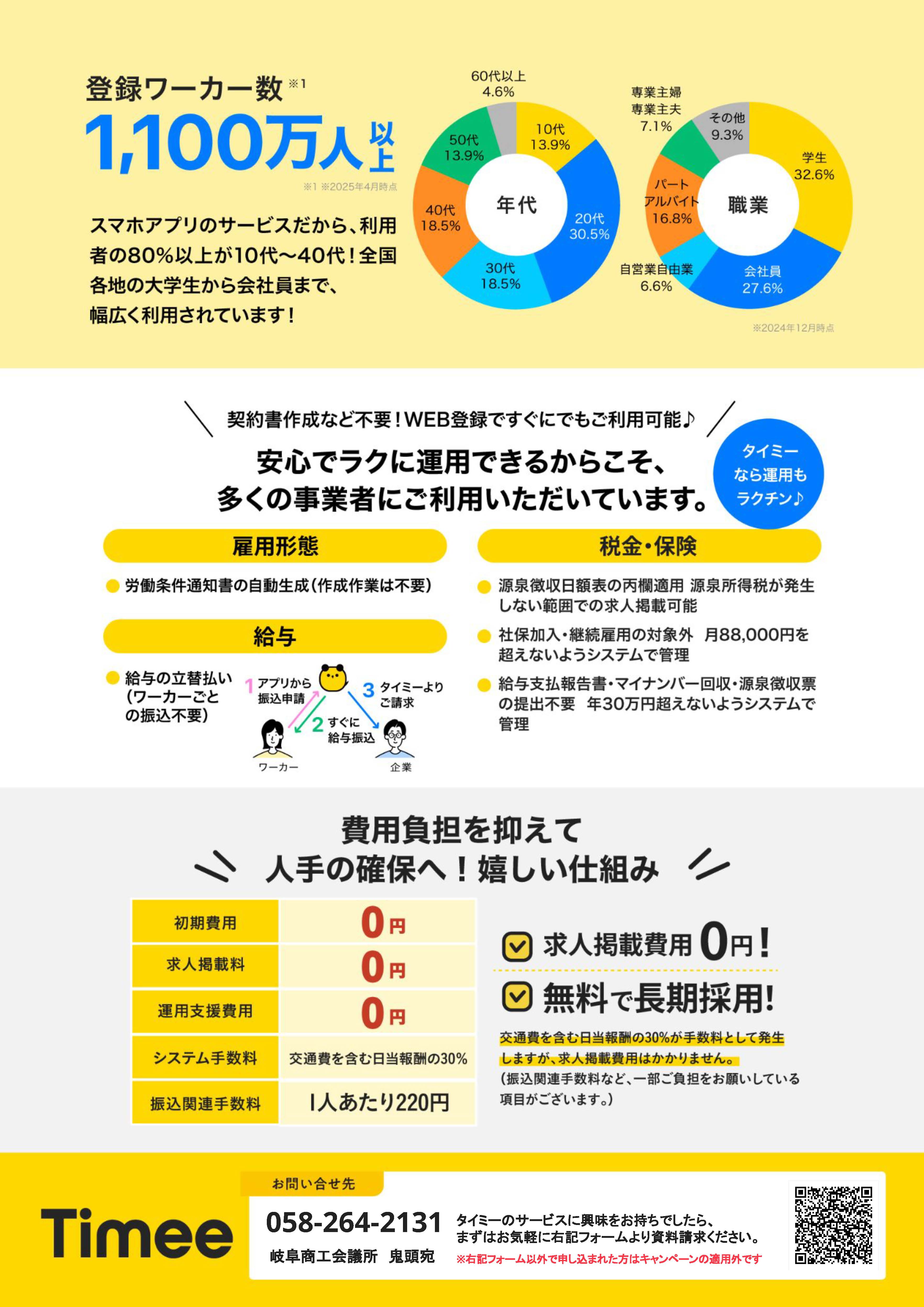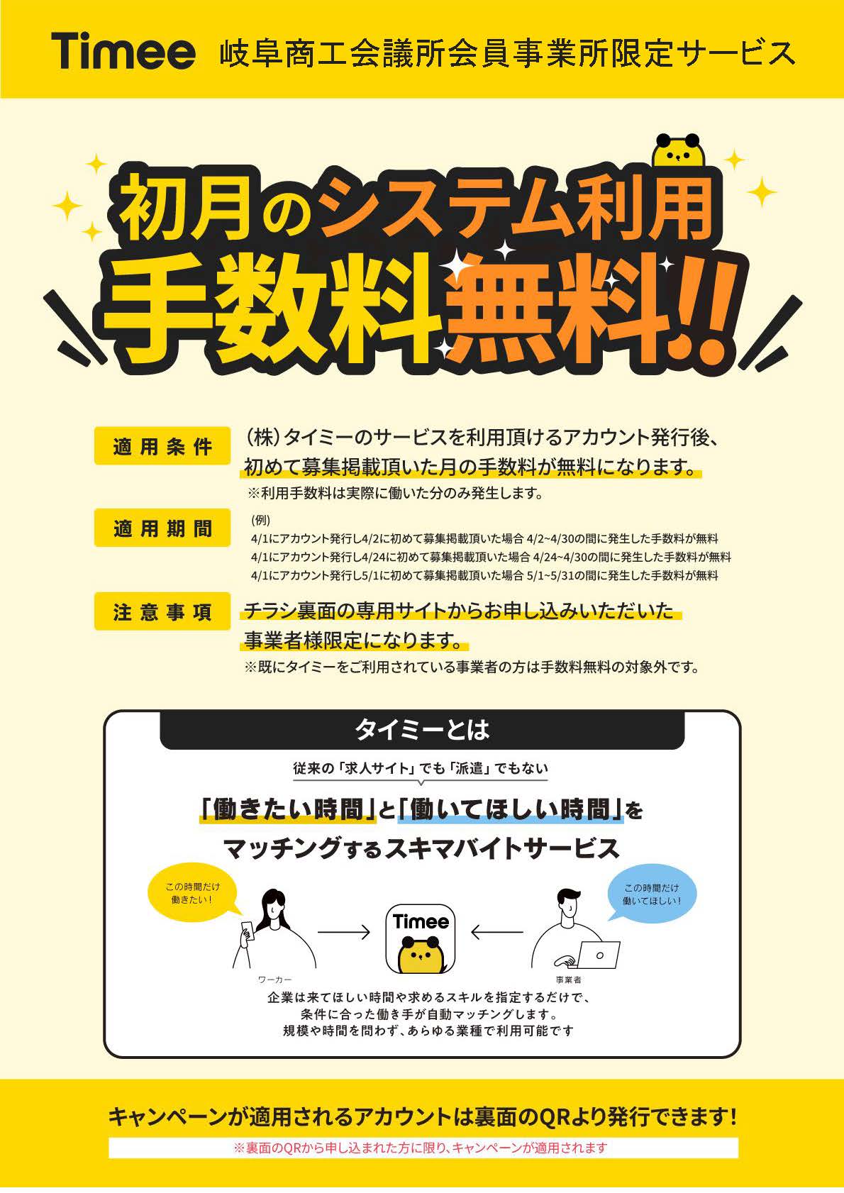 岐阜商工会議所の会員であればタイミーのシステム手数料が初月無料になります。